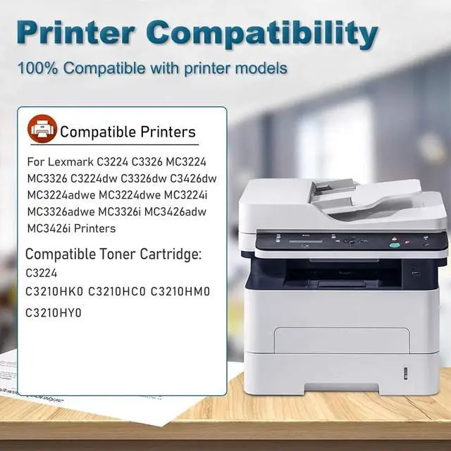 Compatible PrintersC3224 Color toner cartridges (C3210HK0 C3210HC0 C3210HY0 C3210HM0)compatible for Lexmark C3224 C3326 MC3224 MC3326 C3224dw C3326dw C3426dw MC3224adwe MC3224dwe MC3224i MC3326adwe MC3326i MC3426adw MC3426i printers.No Chip, the old chip needs to be replaced