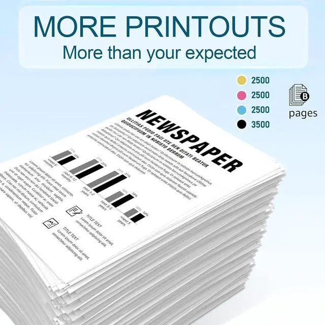 Printed PagesOur compatible standard capacity toner cartridge can print approximately 3500 pages in black and 2500 pages in colour (A4 paper coverage is 5%). High definition transition, fine and uniform, no broken line, no residual ash, solid fixation. Capable of meeting your everyday needs.