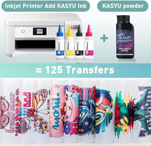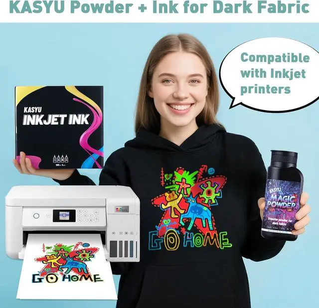 Perfect Pair with KASYU Transfer Powder DTF-Level Results Without the DTF Price! Combined with KASYU Heat Transfer Powder, this ink creates high-opacity, soft-hand-feel transfers that rival expensive DTF printsusing just your basic inkjet printer!