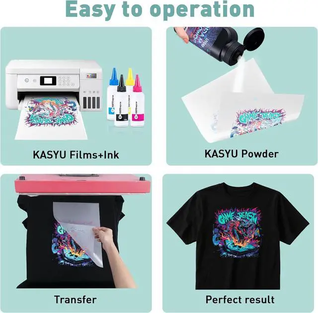 Stunning Print Quality-Experience rich, eye-catching colors that pop on any fabric! KASYU Ink delivers deeper blacks, brighter neons, and smoother gradients for truly professional results.