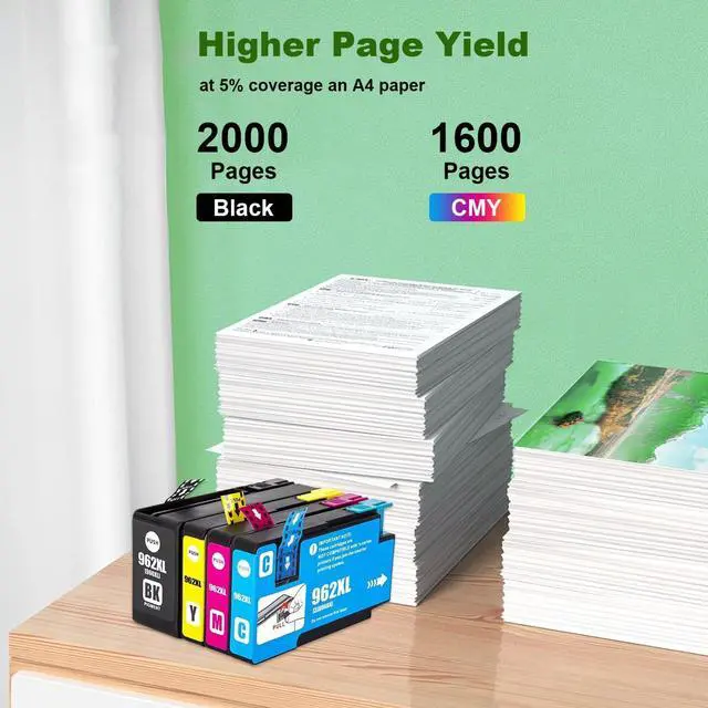 High-Yield Design: Up to 2000 Pages each 962XL black ink cartridges for hp printers, 1600 Pages each for hp ink 962XL color combo pack at 5% Coverage (Letter/A4) that offers more pages per print, reducing replacement frequency, while the tri-color cartridge delivers vibrant, high-quality prints for documents and photos.