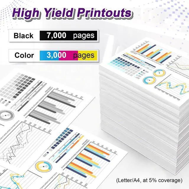 High yield: Our toner cartridge black has a high yield of 7,000 pages and color has a high yield of 3,000 pages to reduce the frequency of cartridge replacements, saving you time and money in the long run, and is cost-effective, with five percent coverage