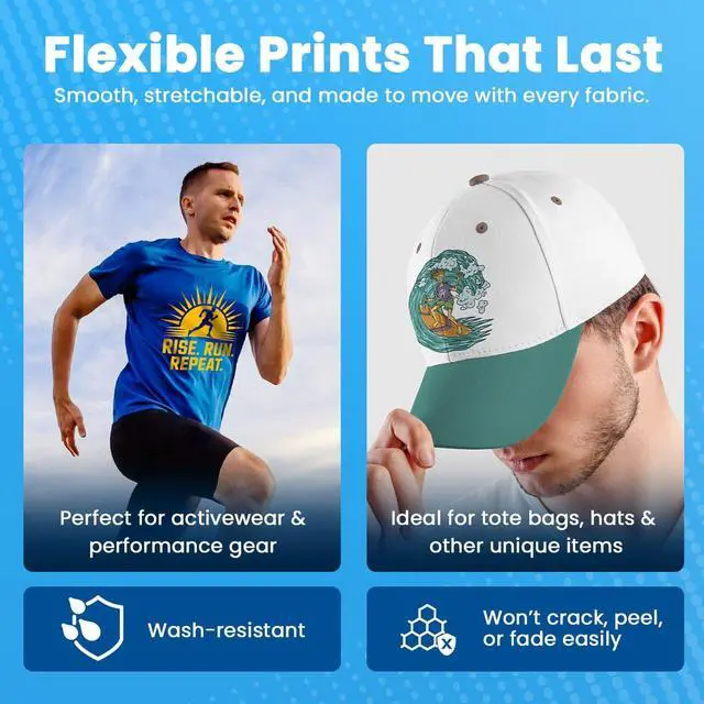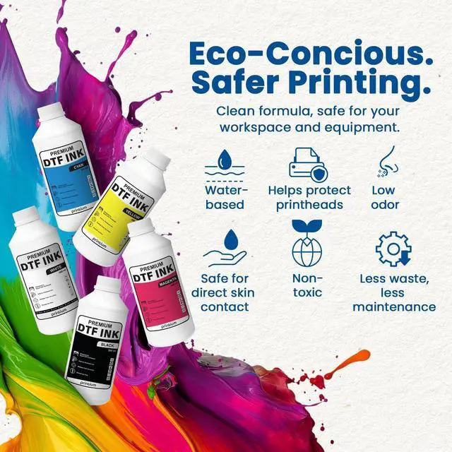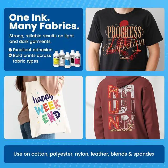 HIGH-FLUIDITY FORMULA FOR SMOOTH PRINTING : Our 500ML DTF ink refill features high pigment density and ultra-fine dispersion to prevent sediment and clogs. Flows smoothly through micro-piezo printheads at all speeds, making it perfect for fast production runs. Maintains color uniformity and sharp image quality from start to finish, with less downtime and maintenance required.