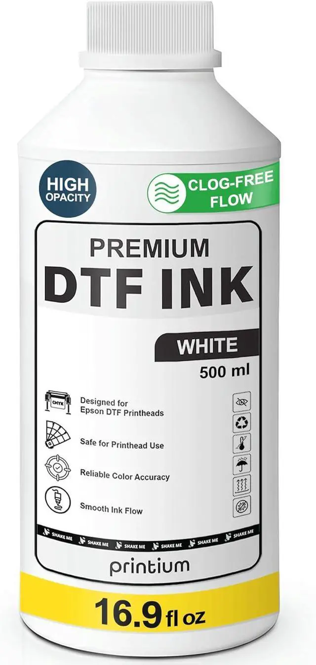 HIGH OPACITY DTF INK FOR BRILLIANT PRINTS : Printium white DTF ink delivers superior brightness and ultra-high opacity on both dark and light fabrics. Ideal for PET film heat transfers onto t-shirts, hoodies, cotton, polyester, and canvas. Produces long-lasting, crisp images that wont fade or crack. Perfect for designers, print shops, and DTF businesses seeking bold white coverage that holds up wash after wash.