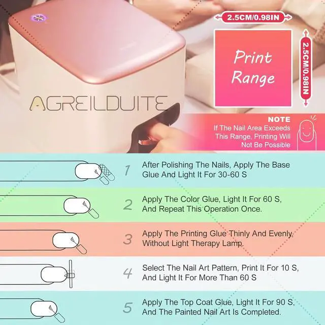 Nail Salon Results in 2 Minutes- Just apply base gel, insert your finger, and let the automatic nail art printer work. Full-hand nail art completes in 2 minutes flat. Zero technical skills needed gorgeous nails by the time your coffee brews.