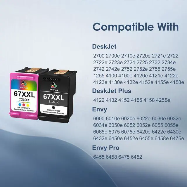 FOR 67XXL INK CARTRIDGES COMBO FOR HP PRINTERS: For DeskJet 2700 series: 2755e 2734e 2755 2700 2700e 2710e 2720e 2721e 2722 2722e 2723e 2724 2725 2732 2742 2742e 2752 2752e 1255 2855e; DeskJet 4100 serie: 4155e 4100 4100e 4133e 4120e 4121e 4122e 4123e 4130e 4132e 4152e 4158e 4155; DeskJet Plus 4122 4132 4152 4155 4158 4255e; Envy 6000 & Envy Pro 6400 series: 6055e 6000 6010e 6020e 6022e 6030e 6032e 6034e 6050e 6052 6052e 6055 6065e 6075 6075e 6420e 6422e 6430e 6432e 6450e 6452e 6455e 6458e 6475e; Envy Pro 6455 6458 6475 6452