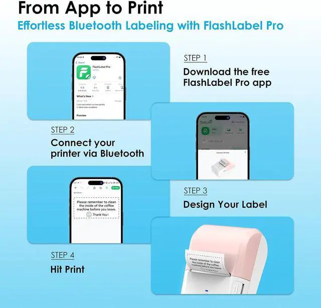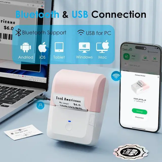 Bluetooth Wireless Printing Made Easy: KNAON Portable Thermal Label Printer supports Bluetooth connectivity, enabling smooth wireless printing from your smartphone, tablet, or laptop. To get started, for iOS and Android users, simply download the FlashLabel Pro app from the Apple App Store or Google Play Store. Please note: Devices must connect through the FlashLabel Pro app direct Bluetooth pairing is not supported.