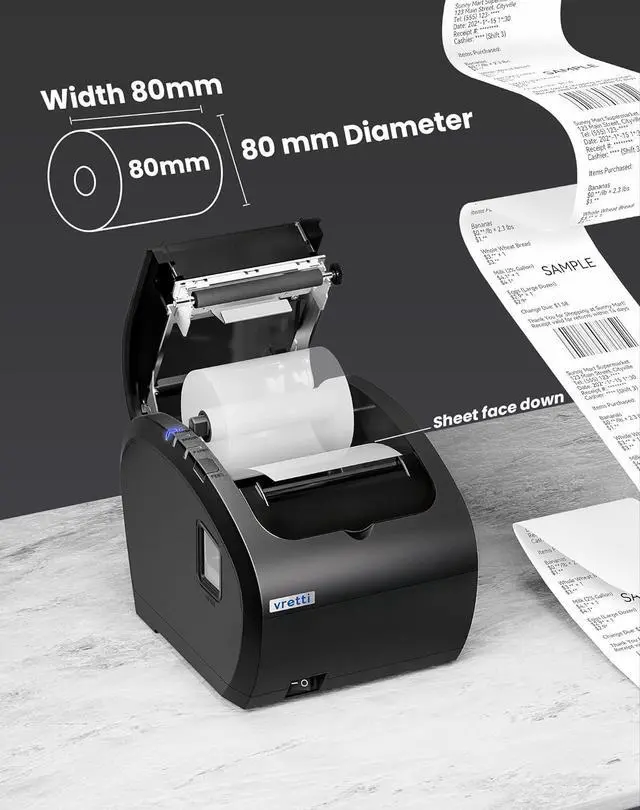 Cost-Efficient & Green PrintingIncludes 1 roll 80mmx30mm thermal paper roll to get started immediately. Unlike ink-based printers, VRETTIs thermal technology eliminates ink costs and reduces waste. Energy-efficient with low power consumption, ideal for 24/7 operations.