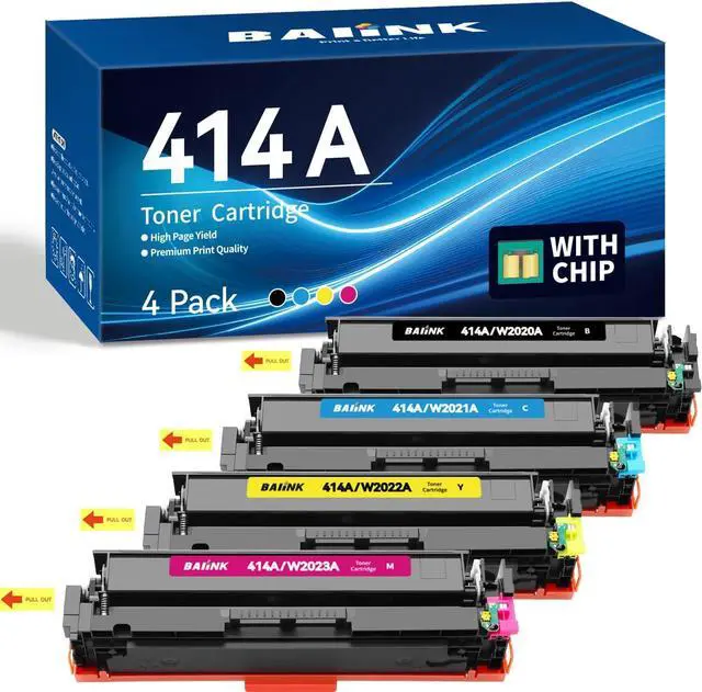 Package Contents: Replacement for hp414a includes 1 x 414A Black (W2020A), 1 x 414A Cyan (W2021A), 1 x 414A Magenta (W2023A), 1 x 414A Yellow (W2022A), all with latest chips