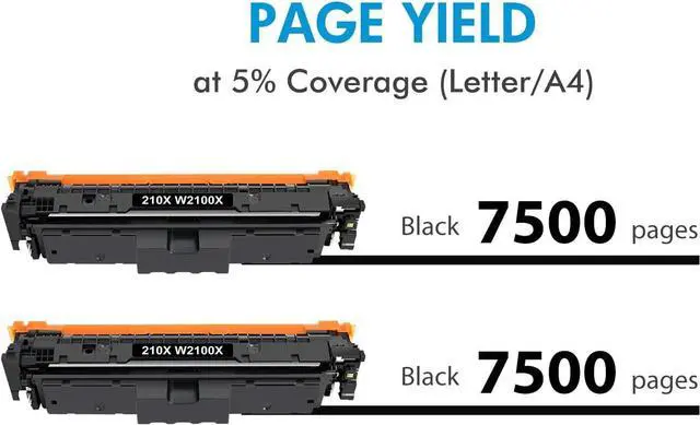 High Page Yield: Up to 2 x 7,500 Pages per 210X W2100X Black Toner Cartridges (Letter/A4, at 5% Coverage)