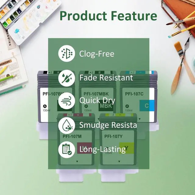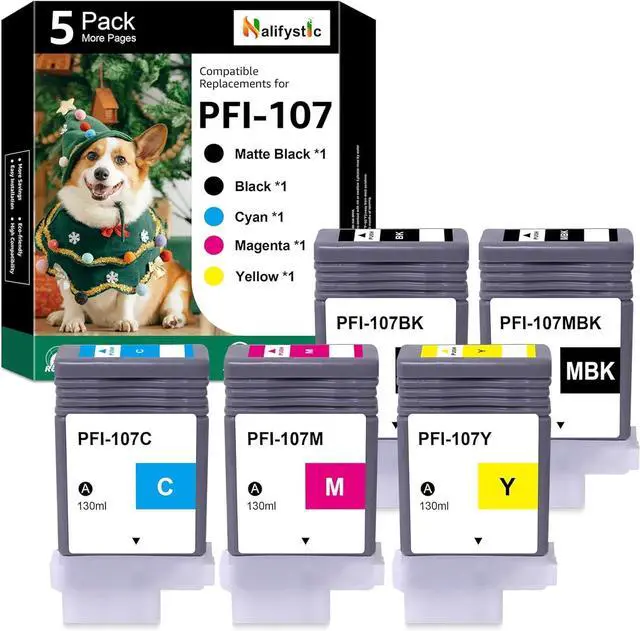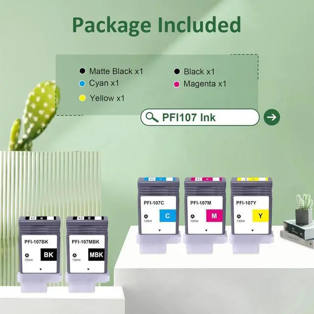 Package Contents: 5Pack compatible PFI-107 Ink Cartridges (2Black 1Cyan 1Magenta 1Yellow, 5-Pack).