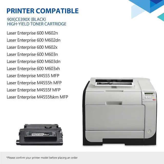 This Cartridge Works with: Laser Enterprise 600 M602dn, M602n, M602x, M603dn, M603n, M603xh; Laser Enterprise M4555f MFP, M4555fskm MFP, M4555h MFP Printer