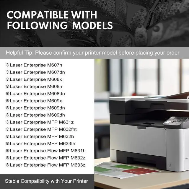 This cartridge works with: Laser Enterprise M607n M607dn M608x M608n M608dn M609x M609dn M609dh; Laser Enterprise MFP M631z M632fht M632h M633fh; Laser Enterprise Flow MFP M631h M632z M633z Printer