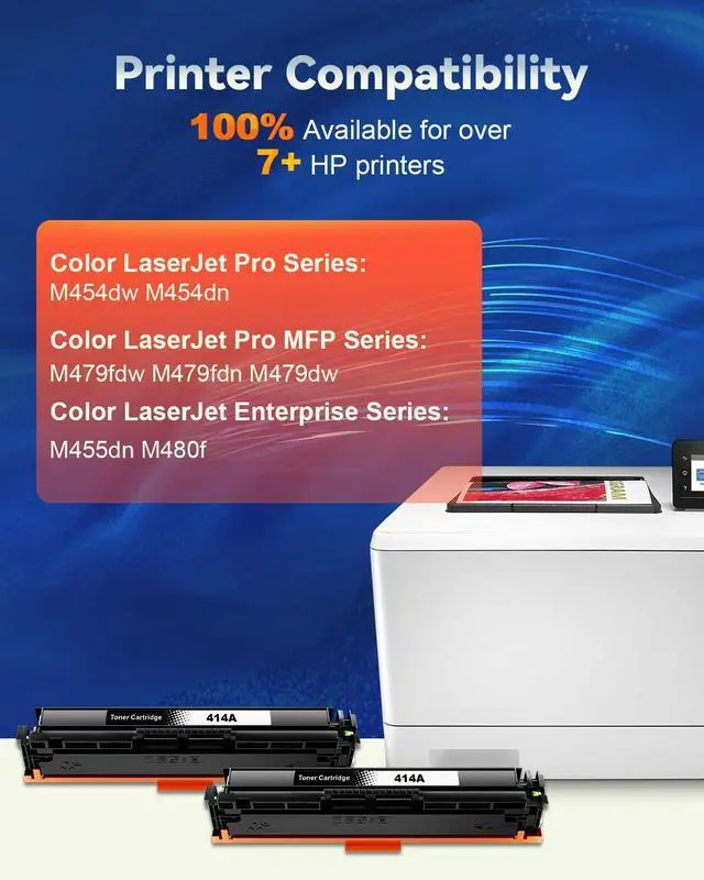 Printer Compatibility: 414A Black Toner Cartridge for HP 414A 414X Works well with HP Color Laserjet Pro MFP M479fdw M479fdn M479dw M479dw, Color Pro M454dw M454dn, Color Pro MFP M479 M454, Color Enterprise M455dn, MFP M480f laser printer