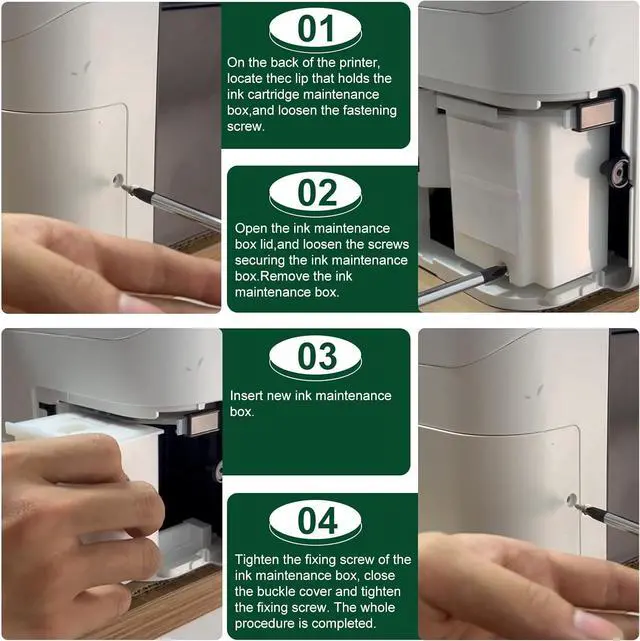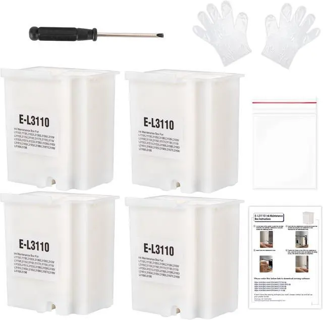What's in the box: Replacement Maintenance Tank (Ink Pad Sponge Included) * 4, screwdriver * 1, Seal bag * 1, instruction sheet * 1, disposable gloves * 2, Everything you need to replace the maintenance box is in the box, easy to do.