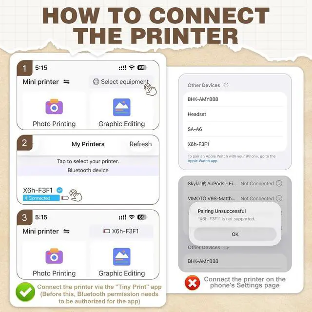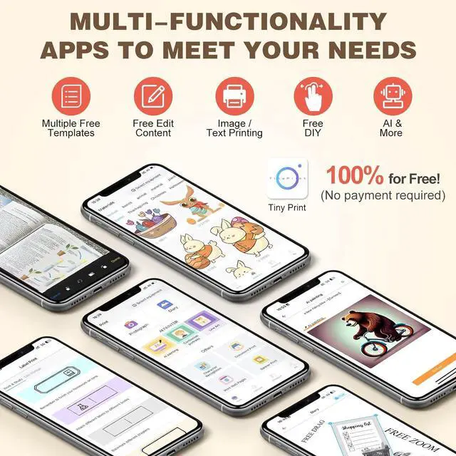 Bluetooth One-Click Printing APP: The label printer uses the "Tiny Print" app Bluetooth connection, no other complicated processes are required, just follow the connection instructions to quickly connect to the smartphone, the app is equipped with free zoom and drag options, OCR functions and stickers Lots of templates, editing options, and text