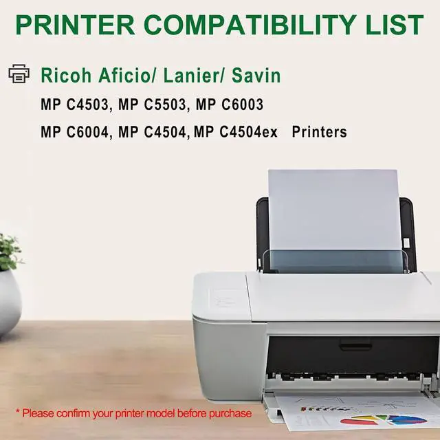 Compatible Printers: Compatible with Ricoh Aficio MP C6003, MP C4503, MP C5503, MP C6004, MP C4504, MP C3504ex, and other selected models from Ricoh, Lanier, and Savin.