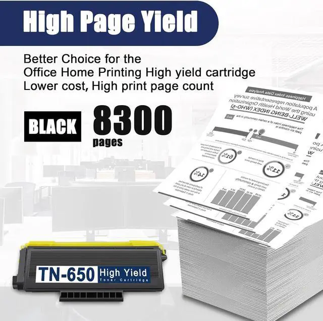 Cartridge yield (approx): TN650 Toner Cartridge 8,300 pages per black cartridge at 5% coverage (Letter/A4)