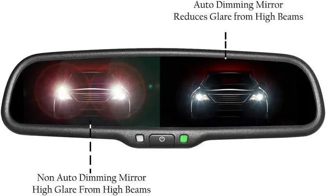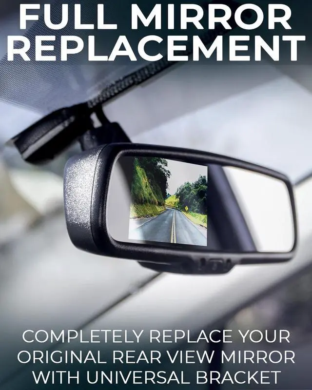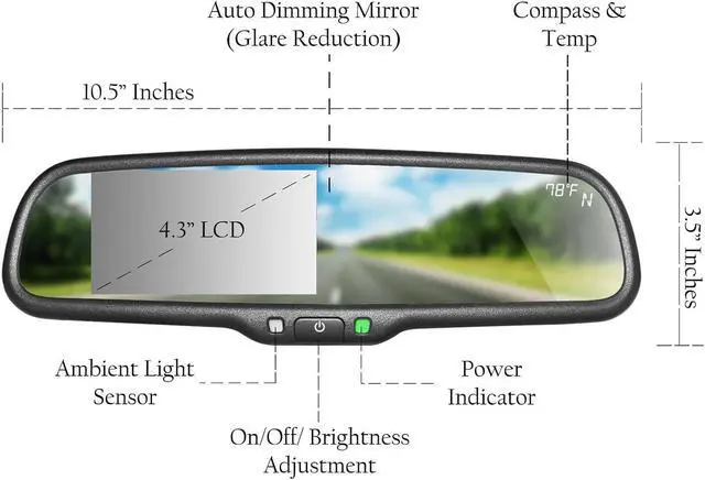 Screen: 4.3" TFT LCD - Auto Adjusting Brightness with AUTO DIMMING MIRROR Brightness: Ultra High Brightness Inputs: 2 Video RCA Inputs Mirror: 4mm Thick Glass with Compass and Temperature LCD Display Automatically Turns On When Vehicle Put In Reverse