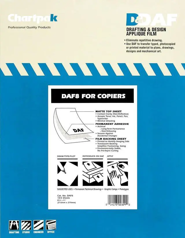 Self-Adhesive Drafting Applique Film. Enhance creative graphics, save time and quickly reproduce repetitive details. 8-1/2 x 11. Enhance creative graphics, save time and quickly reproduce repetitive details. 8-1/2 x 11. 100 sheets per box.