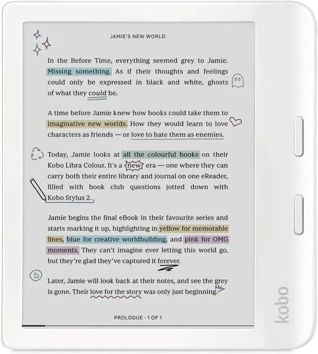 , , - Dive into your stories with colorful markups. With Kobo Stylus 2* compatibility (*sold separately), annotate, highlight, and note take your eBooks in color