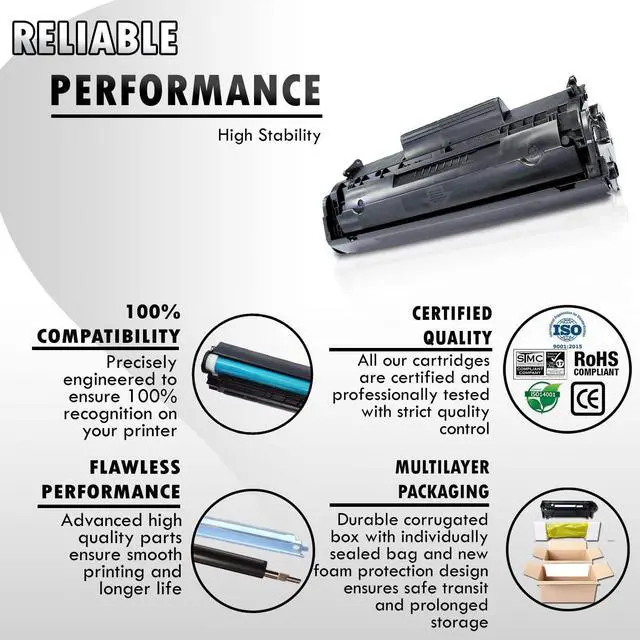 These Inkfirst compatible toner cartridges replacement for HP Q2612A 12A are manufactured in ISO9001 certified factories. These compatible toner cartridges replacement for HP Q2612A 12A are warrantied with a Two Year Guarantee Policy against manufacturing defects