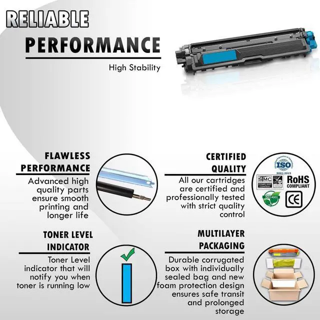 These compatible TN225C (TN-225C) Toner cartridges are manufactured in ISO9001 certified factories. This ensures that our Toner cartridges for Brother TN221 TN225 Cyan will provide the same premium printing quality as the OEM products.