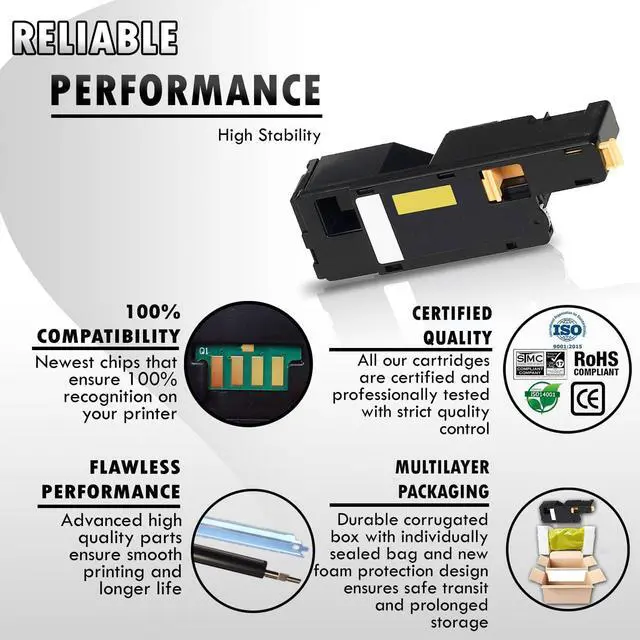 These compatible 6010Y (106R01629 / 106R1629) Toner cartridges are manufactured in ISO9001 certified factories. This ensures that our Toner cartridges for Xerox 6010 Yellow will provide the same premium printing quality as the OEM products.