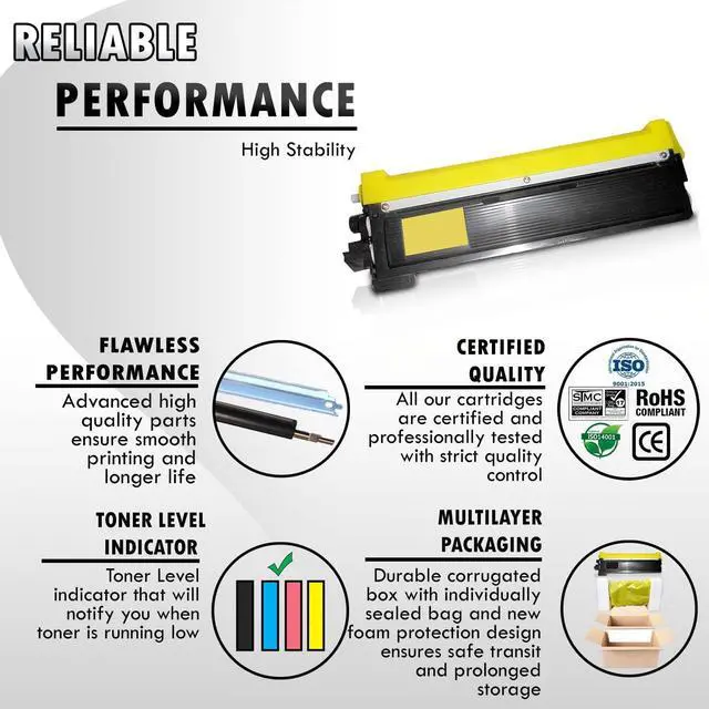 These compatible TN210Y (TN-210 Y) Toner cartridges are manufactured in ISO9001 certified factories. This ensures that our Toner cartridges for Brother TN210 Yellow will provide the same premium printing quality as the OEM products.