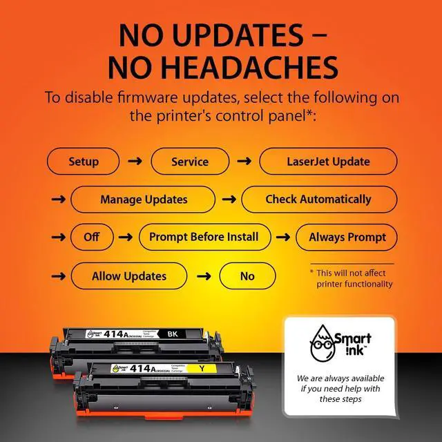 Always the Latest Chip Version: Every Smart Ink replacement for an HP 414 toner cartridge is equipped with the most up-to-date version of the chip and works well with all compatible printers, including those with the latest firmware