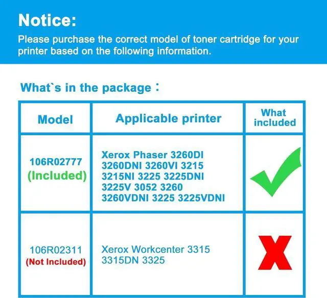 Compatible PrintersReplacement for Xerox Phaser 3260DI 3260DNI, 3260VI WorkCentre 3215 3215NI 3225 3225DNI 3225V Phaser 3052 Phaser 3260 3260VDNI Workcentre 3225 3225VDNI