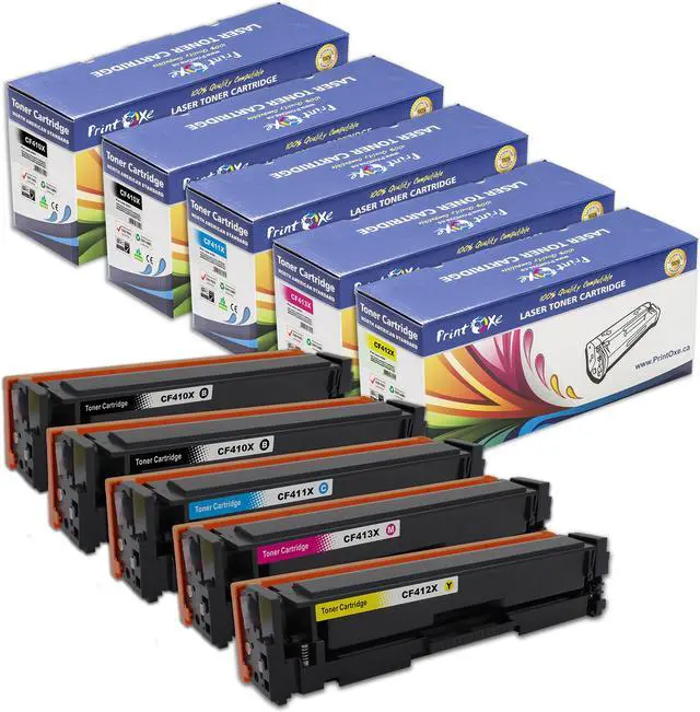 5 Compatible Laser Toner Cartridges Replacement for HP ; 2 Black CF410X, 1 Cyan CF411X, 1 Yellow CF412X, & 1 Magenta CF413X High Yield. Complete Set plus Black.