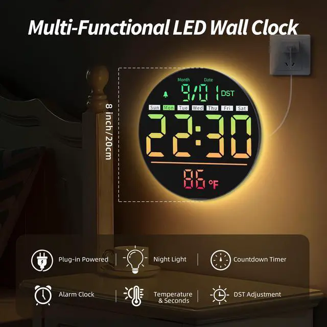 Maxstar Multifunctional 8'' Digital Wall Clock - Plug-in Powered
