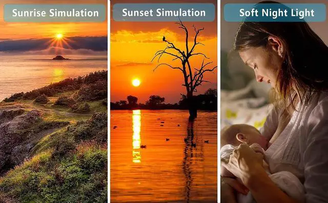 2: Full Screen LED Display Panel - This sunrise alarm clock truly achieves full screen display. Most of the similar products on the market can not achieve the full display effect. This light alarm clock uses the latest digital technology to make the time display clearer and the light brighter and softer. Help you wake up more easily.