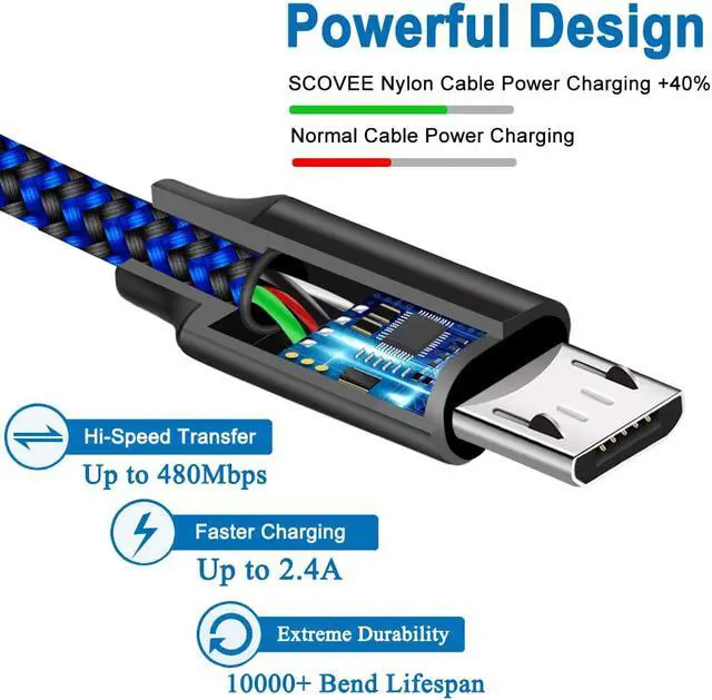 Durability]: The stainless steel connector heads slot in easily and steadily, and won't get loose or fall out from your devices. The durable Nylon Braided cable jacket protects wire cores and keep the cable quite robust and flexible. Nylon braided micro usb cable can bear 10000+ bending test, Service life much longer than standard cell phone charger cable.