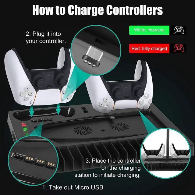 CONTROLLER CHARGING & LED INDICATE: Keep USB C type dongle plug in the controllers, and simply place the PS5 Controller on the Charging Station, and it will begin charging automatically. Touch the LED power icon to power on. Allows you to charge 2 controllers at the same time, the green light turned to red while charging and stays green after fully charged. Recommended using 5V/ 1.5 -2A power adapter source to provide sufficient current)
