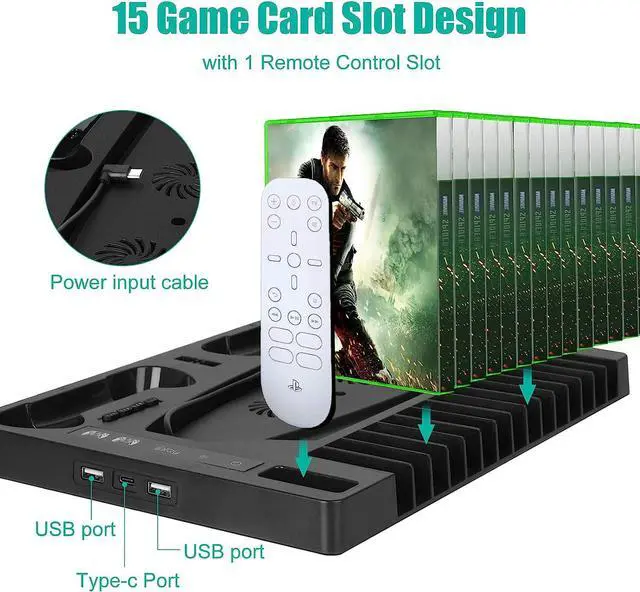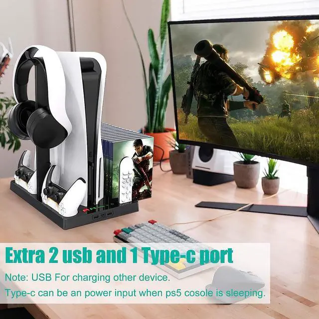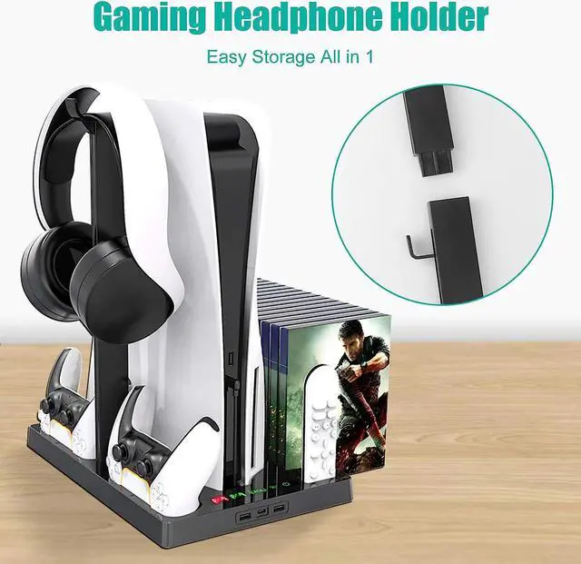 STORAGE MULTI-FUNCTION: PS5 Console vertical stand and PS5 controller charging dock, it also has many large stable and safe storage and for 15 game slots, media remote, Gaming headphones holder. Keeping your ps5 cool keeps everything for your system organized, durable.