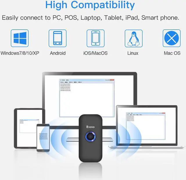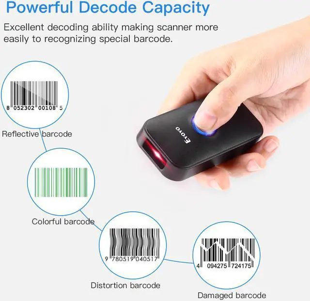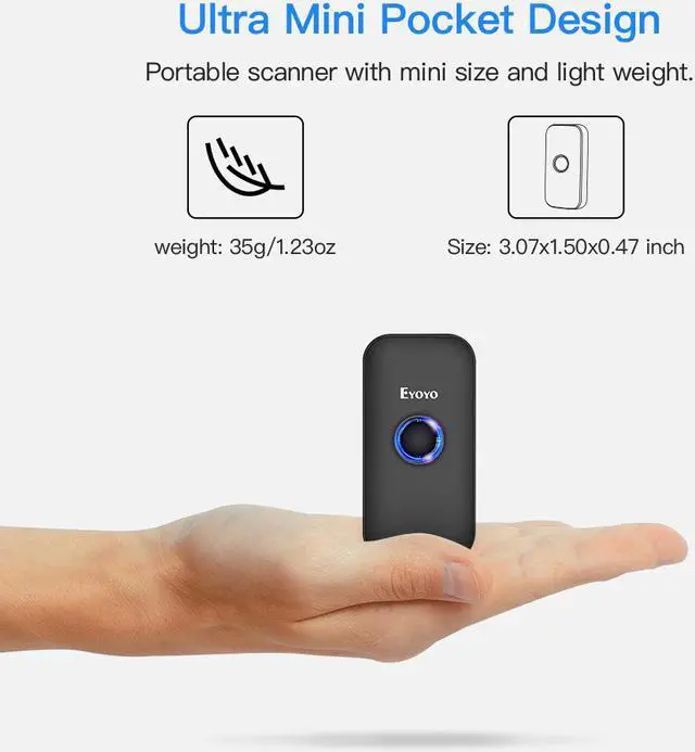Eyoyo Mini Pocket 1D barcode scanner with Bluetooth, 2.4G Dongle Wireless and Wired 3-in-1 Connection Modes.
