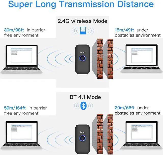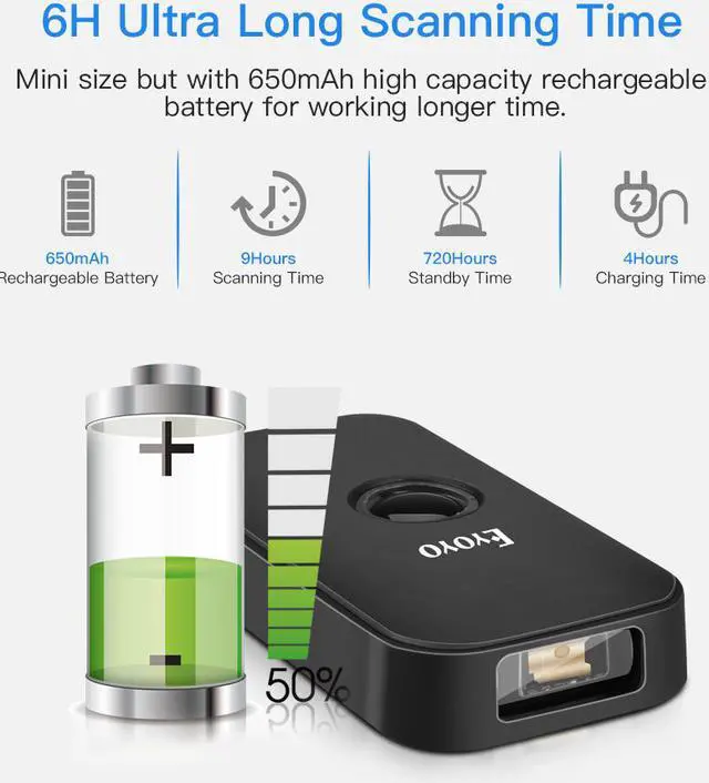 6. 650mAh rechargeable battery can use up to 5H continuous scanning time, only need 2H to charge. Standby time is up to 30days.