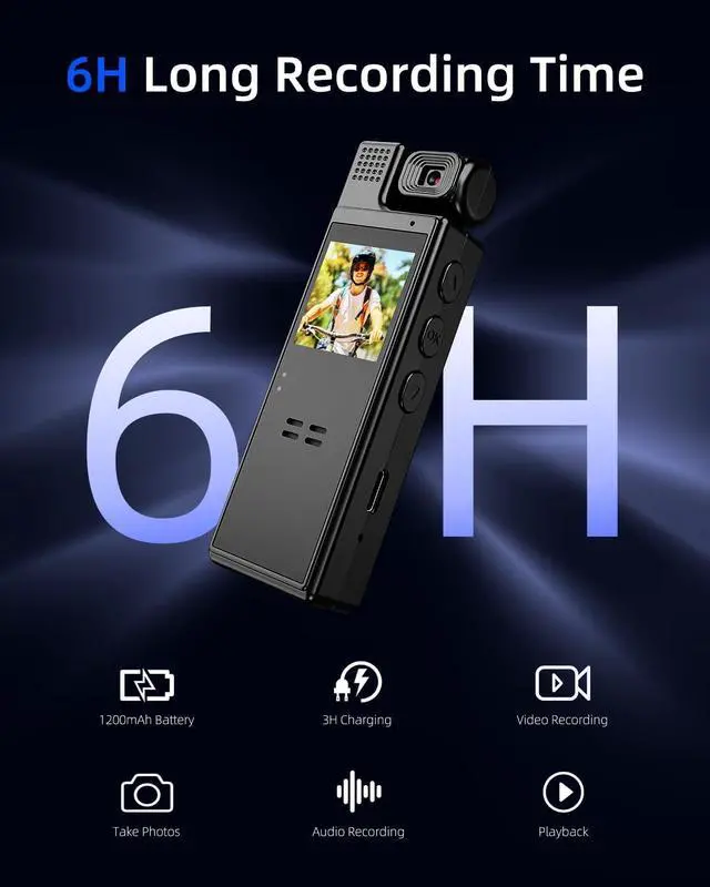 Long-lasting Battery Life: With a powerful 1200mAh rechargeable battery, this portable body cam provides an impressive 6-8 hours of continuous recording time, allowing you to capture your entire adventure or monitor your surroundings without worrying about running out of power.