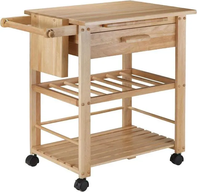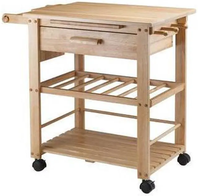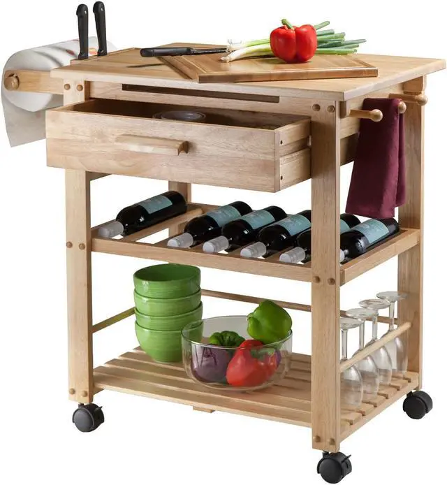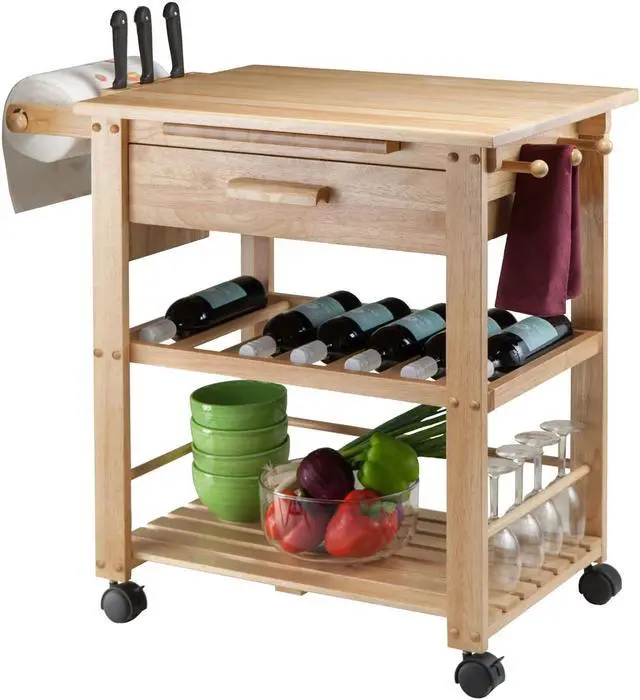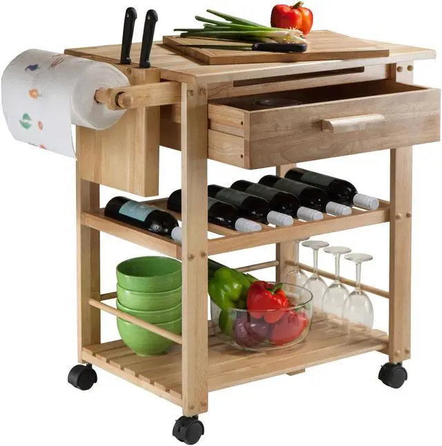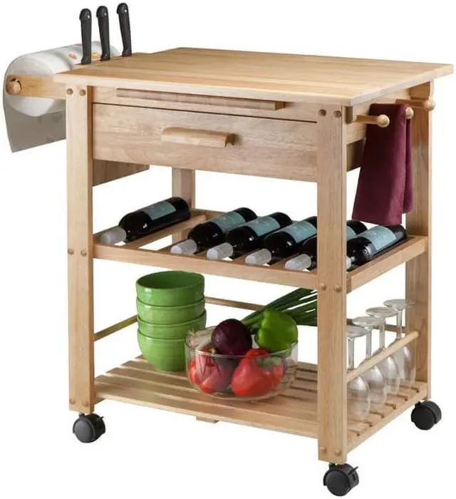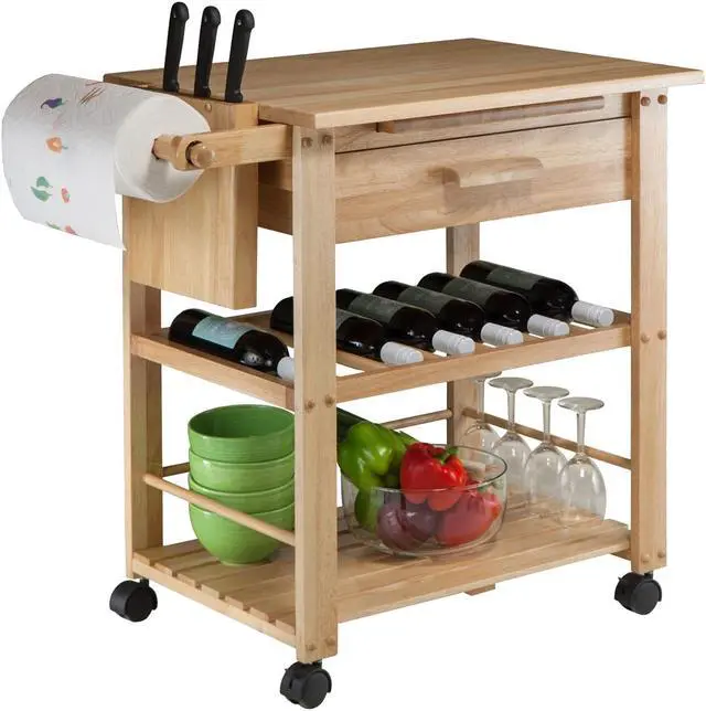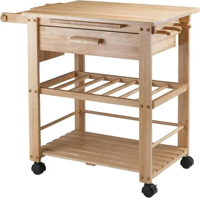 Finland Kitchen Cart By Winsome Wood The ultimate kitchen cart, the Natural Finland cart provides bevy of storage options and a spacious workspace. Hide utensils and cutlery in the deep drawer, keep wine bottle safe and sound on the rack, towels on each hooks, knife block keeps the knives safe then storage plates and glasses on the bottom shelf. Durable casters allow you to easily move the cart. This compact kitchen island is ideal for a small kitchen that needs more workspace. Shelf is 21.1"W X 15.9"D. Drawer inside dimension is 19.75"W X 13.5"D X 4.3"H. Overall cart dimension is 35"W X 20.5"D X 31.5"H. Constructed of solid and composite wood in natural finish. Assembly required.