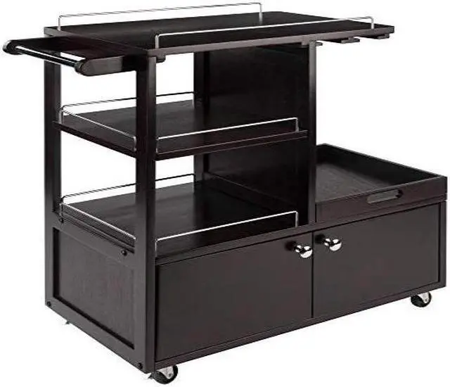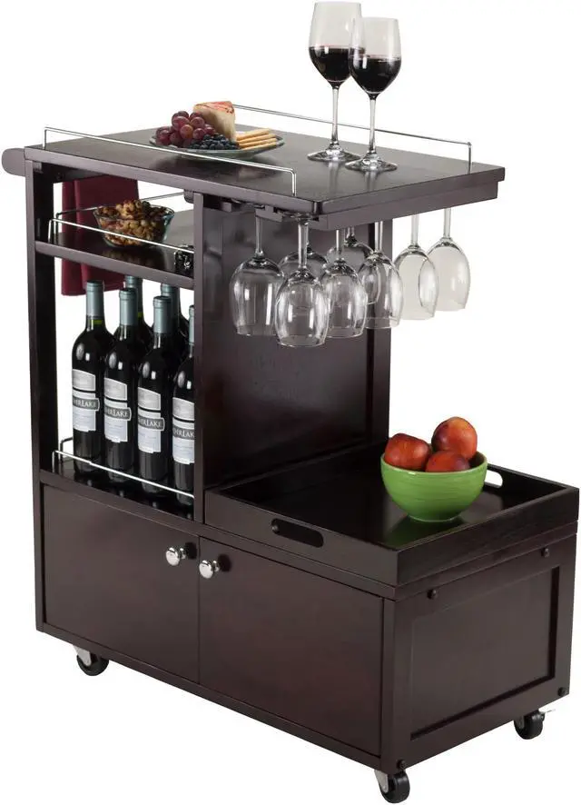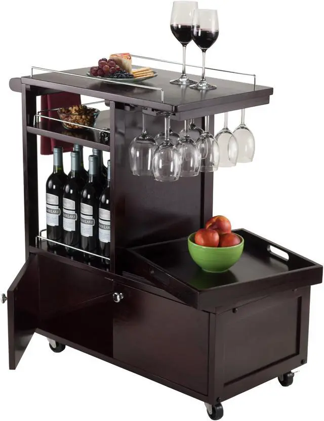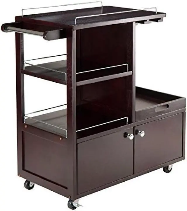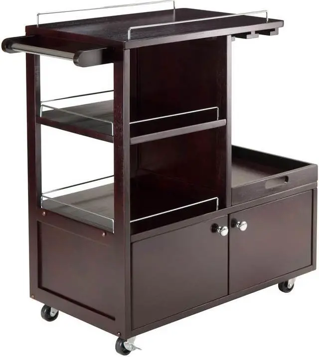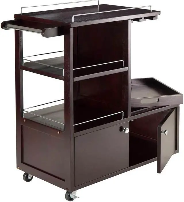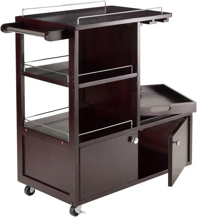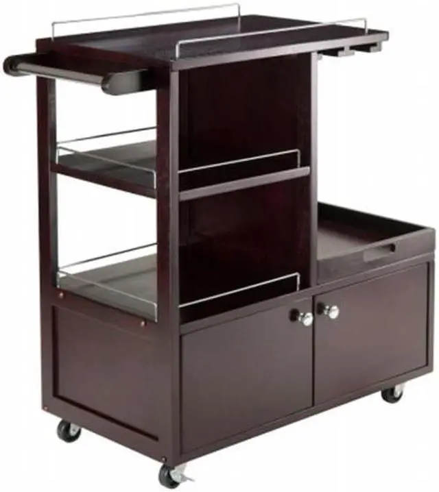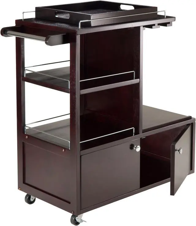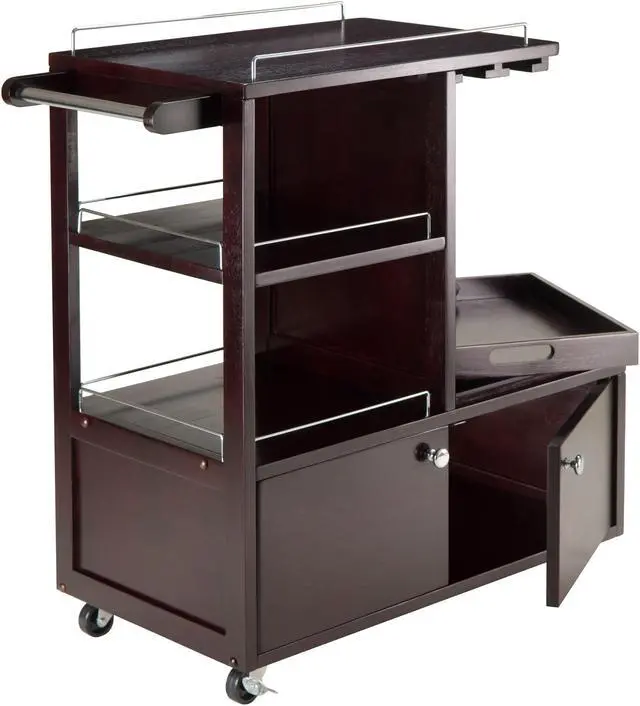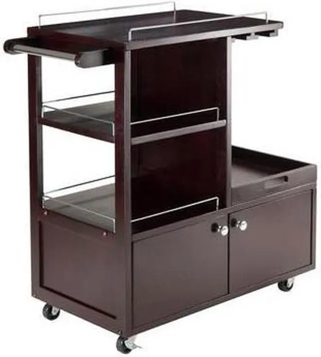 Galen Entertainment Cart By Winsome Wood Galen Cart with Metal accent is full of function for your entertaining. Comes with Serving Tray, Glass Rack, Wine Rack and storage. Perfect for your living room, game room or play room. Stylish and modern look. Cart top serving surface is 24"W X 14.89"D. Removable Serving Tray has inside area of 14.96"W X 13.62"D X 1.46"H. Shelf on the left is adjustable with size of 13.78"W X 9.13"H. Cabinet has wood door and opens to 28.23"W X 14.73"D X 9.21"H for storage. Overall assembled size of 34.25"W X 16.77"D X 34.37"H. Construction with combination of solid and composite wood in espresso finish. Assembly Required.