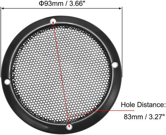 Specifications:Frame Material: ABS PlasticMesh Material: Cold Rolled SteelOuter Diameter: 93mm / 3.66 inchInner Diameter: 75mm / 2.95 inchScrew Hole Diameter: 3.5mm / 0.14 inchMounting Hole Distance: 83mm / 3.27 inchFeatures:Great for speaker cabinet, home speaker or car speaker.Protect your Subwoofer from cuts, rips, tears and dents.DIY speaker grille, suitable for DIY speakers and cars speaker decorative circle.Package Includes:1 x Speaker Grill Cover