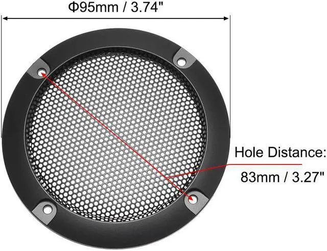 Specifications:Frame Material: ABS PlasticMesh Material: Cold Rolled SteelOuter Diameter: 95mm / 3.74 inchInner Diameter: 71.5mm / 2.81 inchScrew Hole Diameter: 3mm / 0.12 inchMounting Hole Distance: 83mm / 3.27 inchFeatures:Great for speaker cabinet, home speaker or car speaker.Protect your Subwoofer from cuts, rips, tears and dents.DIY speaker grille, suitable for DIY speakers and cars speaker decorative circle.Package Includes:2 x Speaker Grill Cover