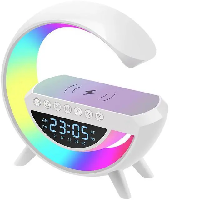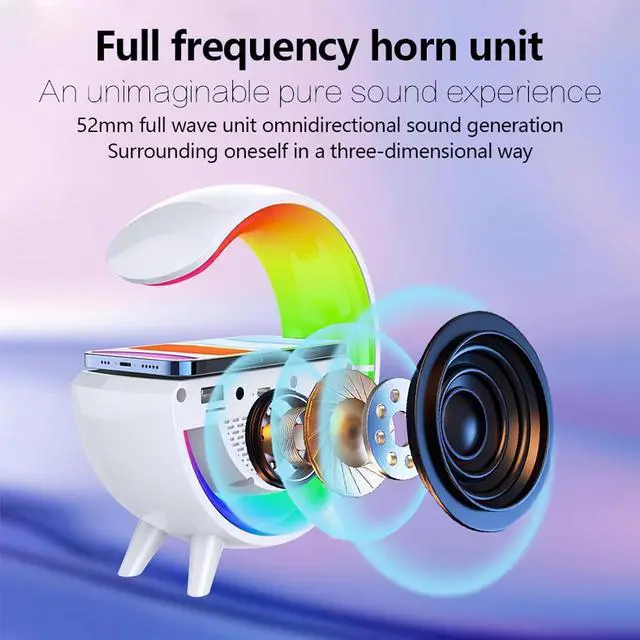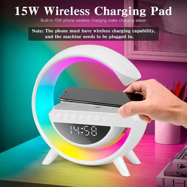 Upgrade your nightstand or workspace with this all-in-one LED Wireless Charging Bluetooth Speaker, designed for modern convenience and multi-functional use. This compact bedside hub combines a 15W wireless charging pad, Bluetooth 5.3 speaker, RGB ambient lighting, and a built-in digital alarm clock - perfect for enhancing both your audio experience and daily routine. Simply place your smartphone on the integrated wireless charger for fast, tangle-free power. Enjoy rich, immersive sound with a unique G-shaped audio design that delivers clear highs and deep bass, ideal for streaming music, podcasts, or calls.