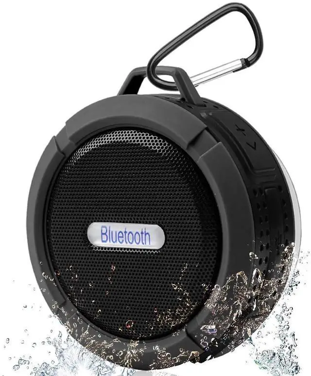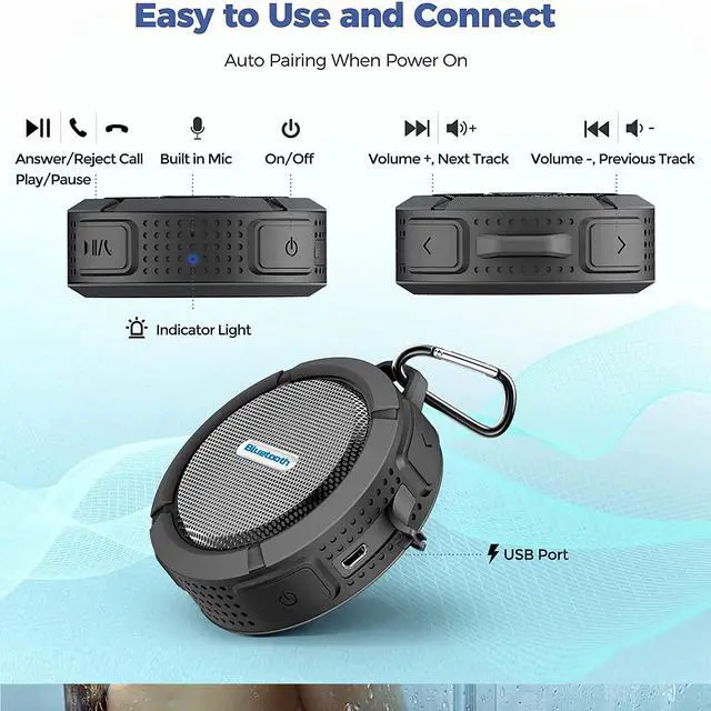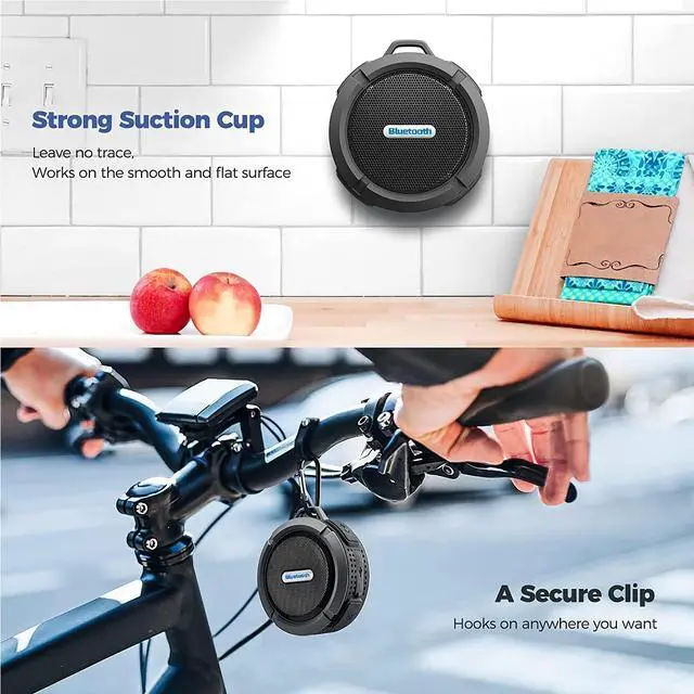Elevate your daily routine with this portable mini Bluetooth speaker, designed for versatility across shower, pool, beach, and travel scenarios. With an IP65 waterproof rating, it's fully protected against water and dust, while the strong suction cup secures it to smooth surfaces - no slipping. Enjoy rich stereo sound from dual fullrange drivers and a deep aluminum bass diaphragm, all wrapped in a fashionable black silicone + ABS shell. Bluetooth 5.0 ensures a stable connection within 20meters and supports TWS, enabling stereo pairing. A MicroSD slot allows playback without a connected device, and a builtin mic supports handsfree calls.