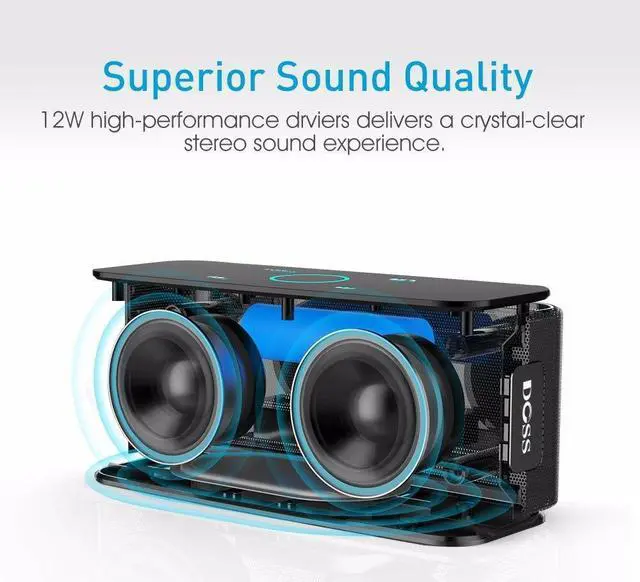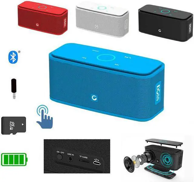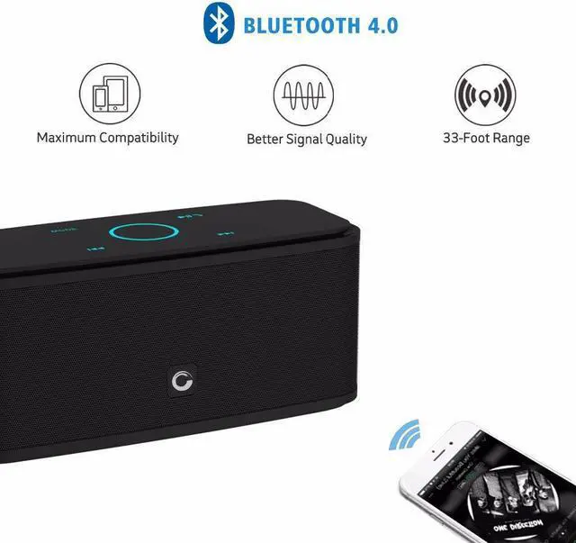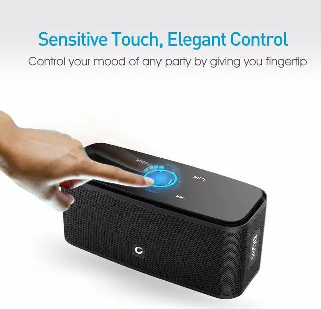 Features: 6W * 2 high-performance dual drivers, 360 degree high definition stereo sound, TF AUX Bluetooth music connection, Sensitive Capacitive Touch Control, Superior Sound Quality, Up to 12 hours of play time, 2, 200 mAh rechargeable lithium-ion battery, Bluetooth, Touch