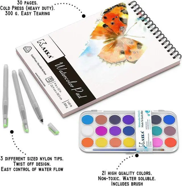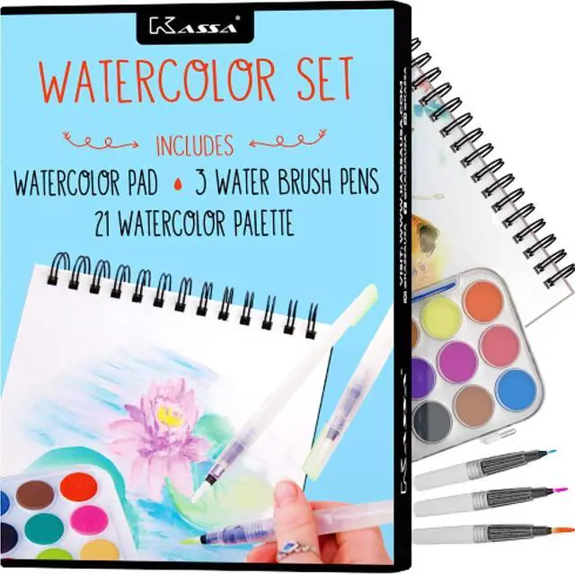 This art set includes: 3 aqua brush pens (assorted sizes), a watercolor paper pad (30 pages) & a paint set (21 colors).