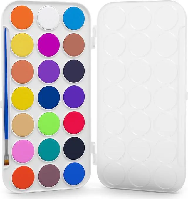 WATER PAINT SET: Includes a wide range of 21 pigmented watercolors, a natural hair brush, and a built in palette. Perfect beginner watercolor sets for adults & kids. Non toxic, water soluble colors formulated to blend easily.