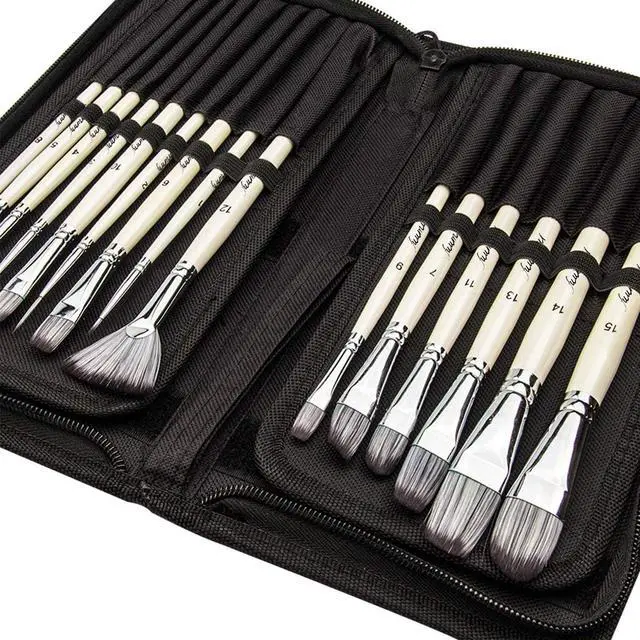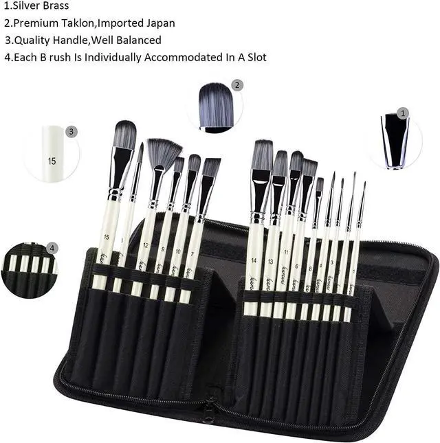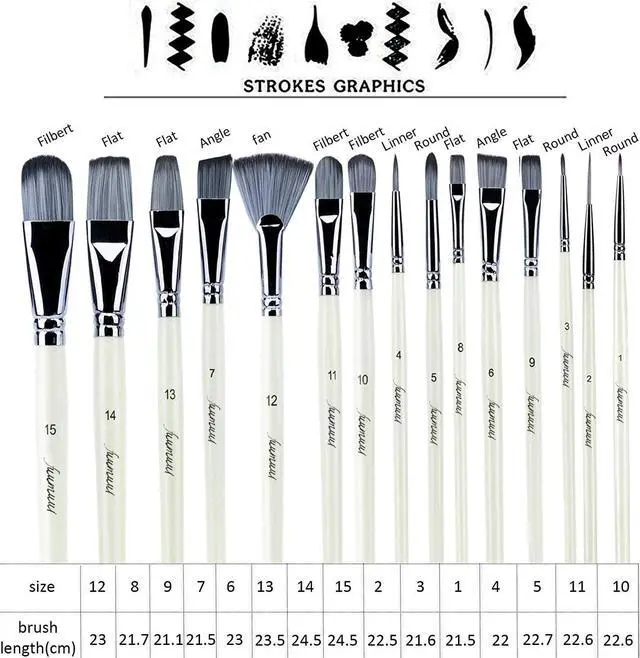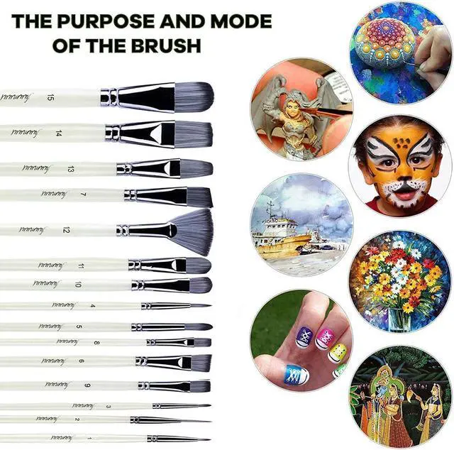 SELECTED COLLECTION OF SHAPES AND SIZES - 15 different shapes and sizes brushes as a set. along with a watercolor sponge, a palette knife. Angle brushes-6#, 7#; Round brushes-1#, 2#, 3#, 4#, 5#; Filbert brushes-15#, 11#, 10#; Flat brushes-14#, 13#, 8#, 9#; Fan brush-12#, 3/0#. The paint brush set could satisfy you whatever detailed painting or largest coat applications, every stroke will come to life.